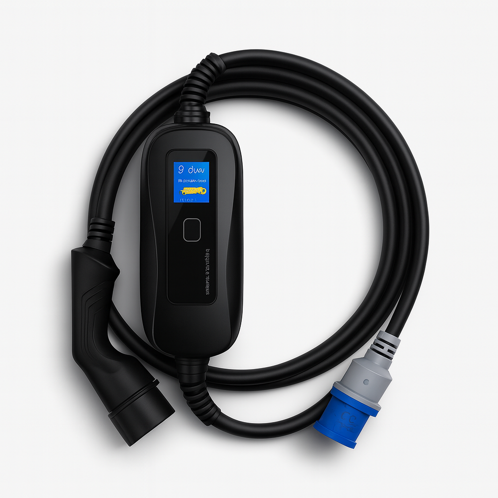 Carregador veicular portátil de 8 kW e 32 A, plug Tipo 2 e tensão bivolt automática 110 V/220 V. Compatível com BYD, Volvo, BMW, Toyota e demais veículos elétricos. Produto seguro, com certificações internacionais CE, RoHs e FCC, proteção IP66 e tela LCD informativa.