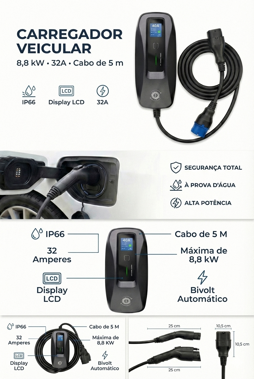 Carregador para carros elétricos DRAWBACK portátil de 8 kW e 32 A, plug Tipo 2