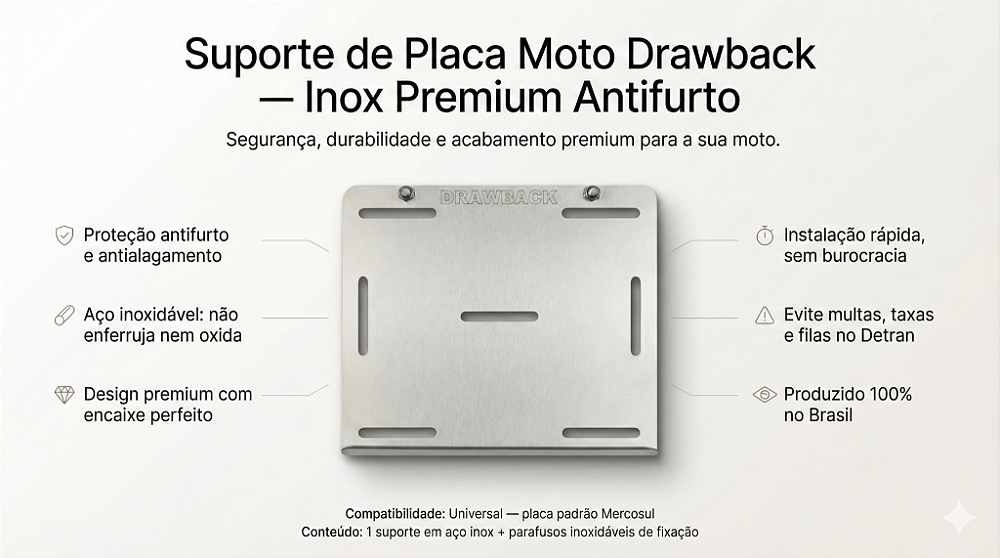 O Suporte de Placa Drawback para Motos é a solução definitiva para quem busca segurança, durabilidade e estilo. Produzido em aço inox de alta resistência, ele não enferruja, evita o roubo da placa e impede a perda em dias de chuva ou alagamentos.